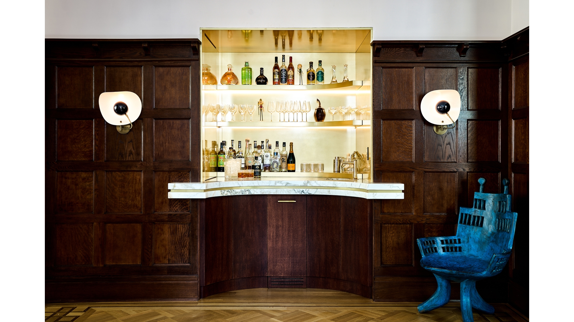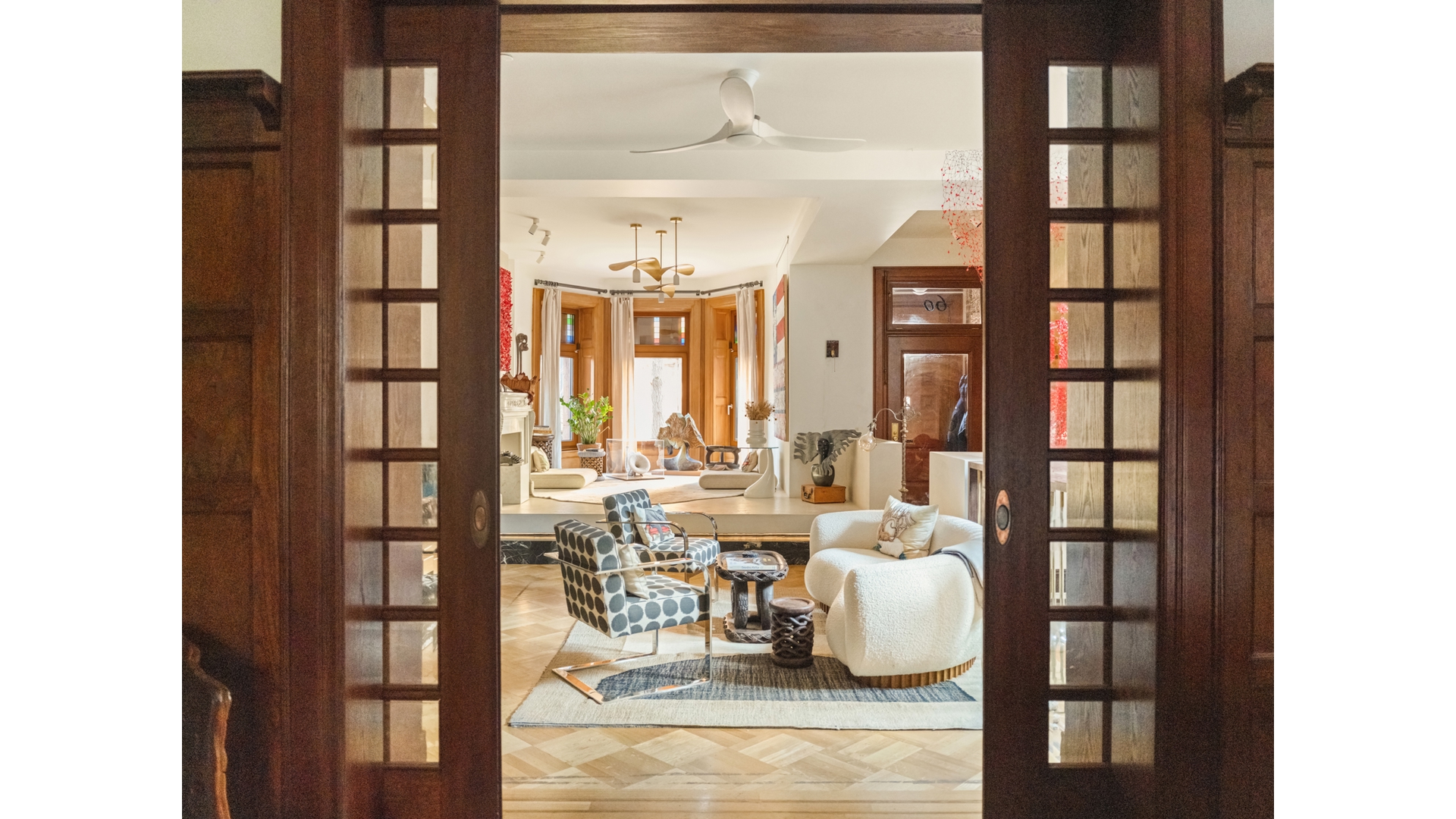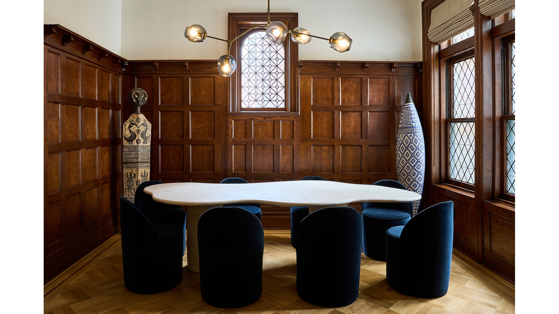 Ascending to the parlor floor, a floating staircase leads to an elegant platform-a truly unique architectural feature. The expansive parlor level preserves much of the opulent original dining room paneling while introducing contemporary design elements.