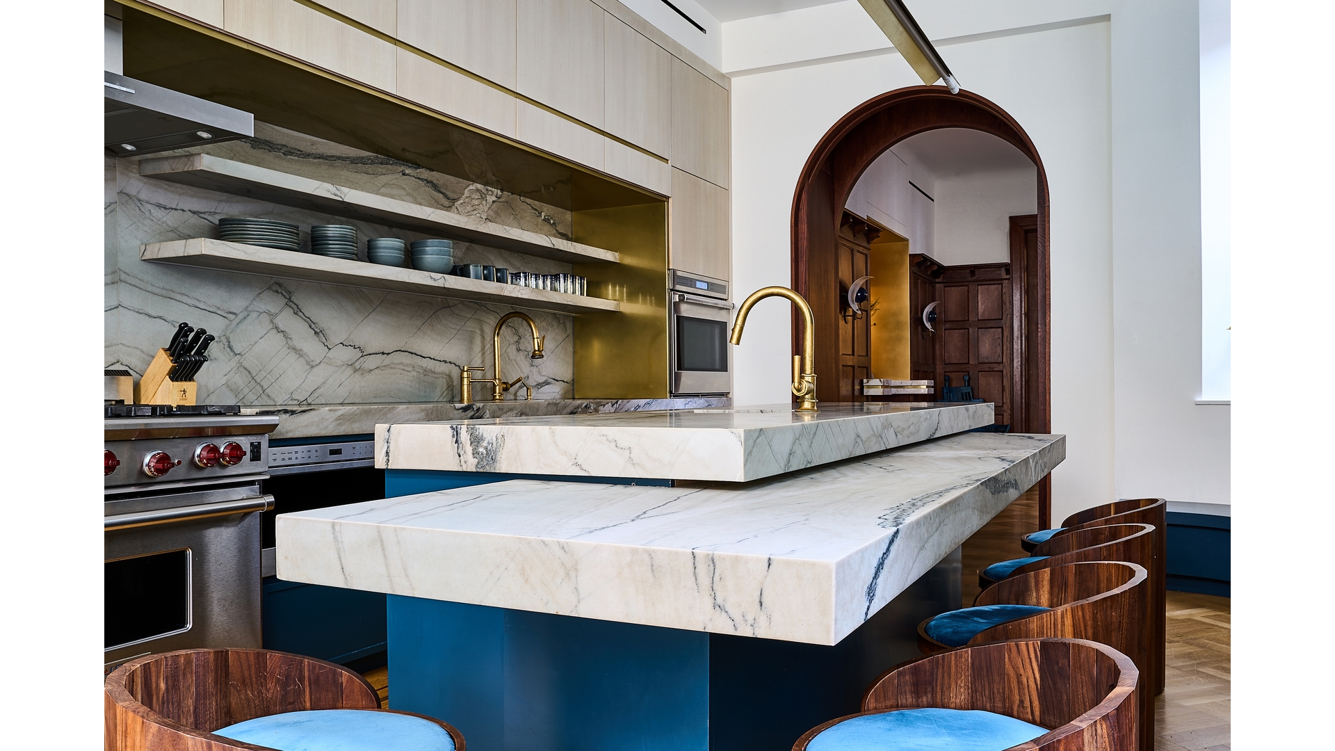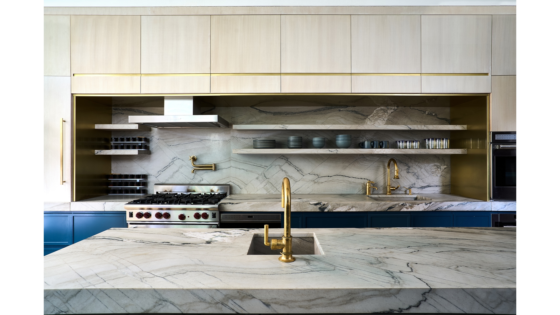 The chef's kitchen is outfitted with custom cabinetry with architectural detailing, Maya Quartzite countertops, Wolf ovens, a convection oven, a microwave, Miele dishwashers, and a Sub-Zero refrigerator with freezer drawers. Waterworks fixtures, pantry pull-outs, custom Oxford Street counter stools, and brass switches and hardware by Buster + Punch complete the space. Extra-high custom triple-pane Ikon patio doors open directly to the parlor deck, creating a seamless transition for dining, entertaining, or quiet mornings outdoors.