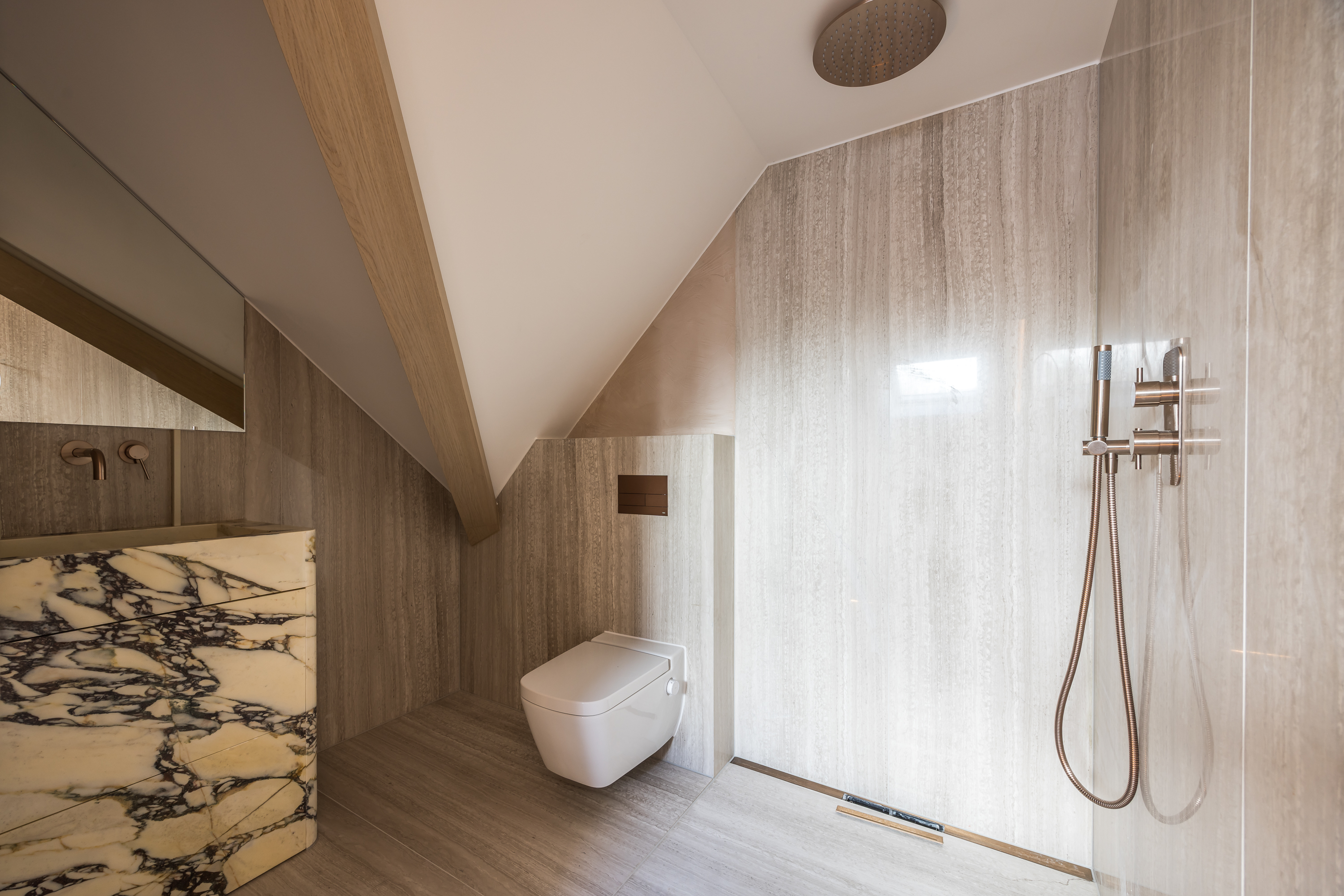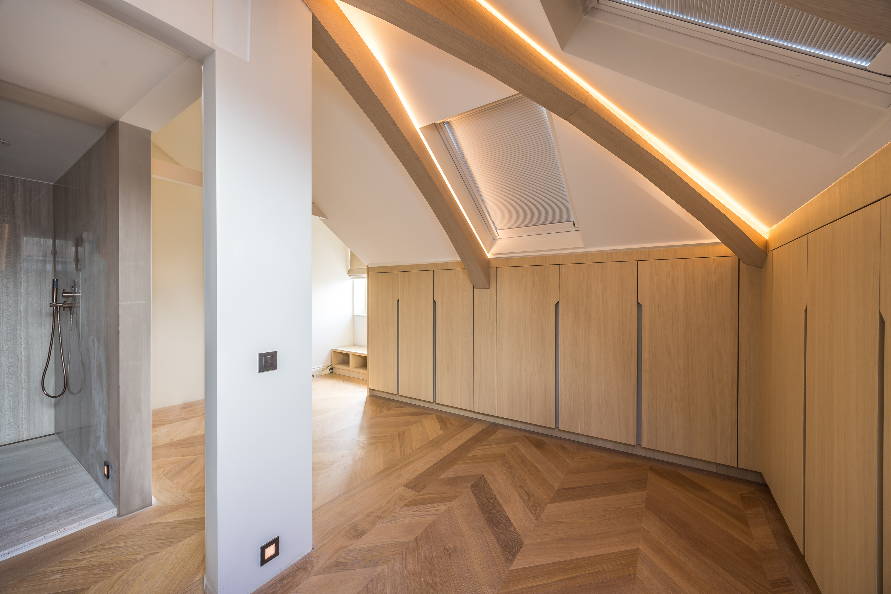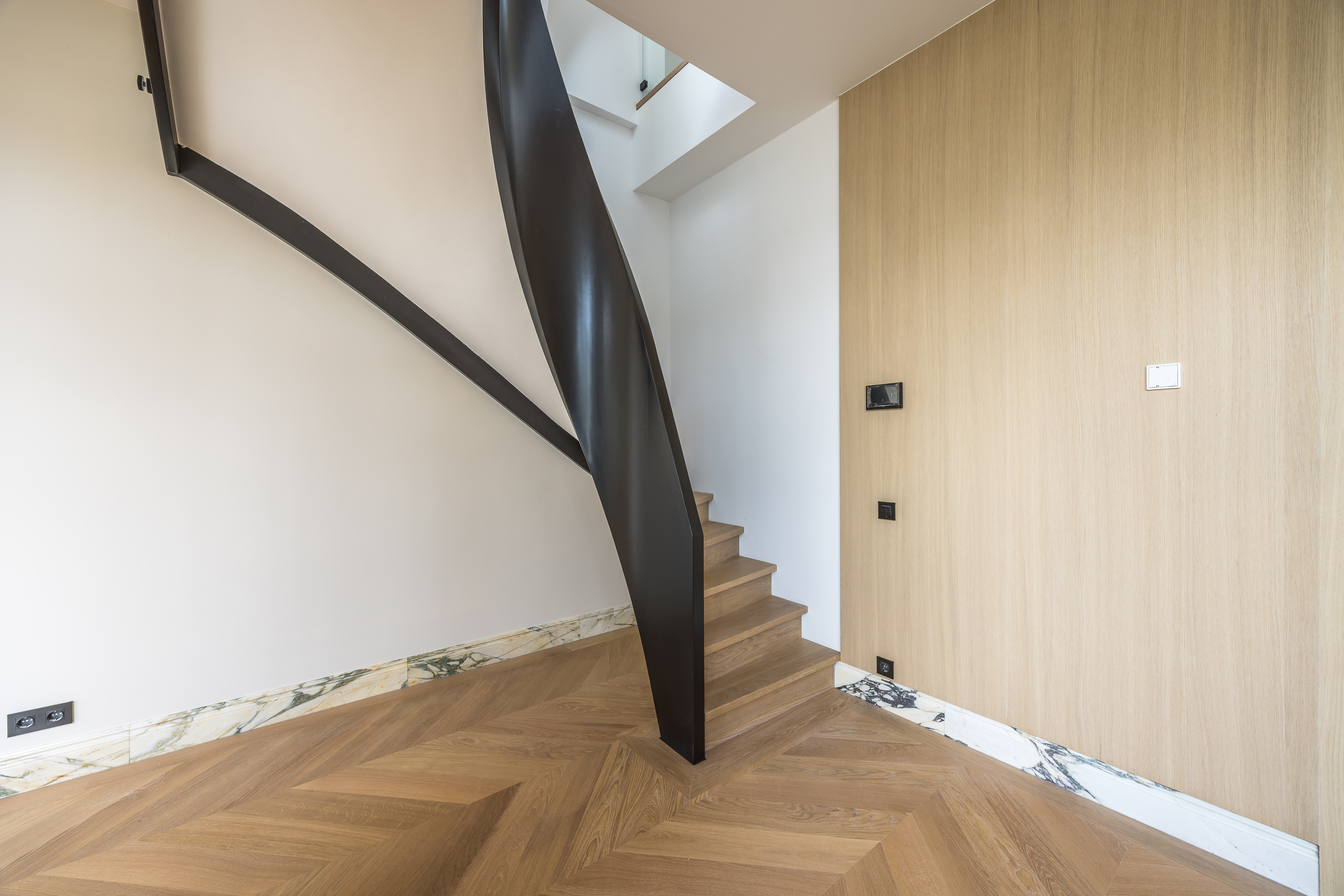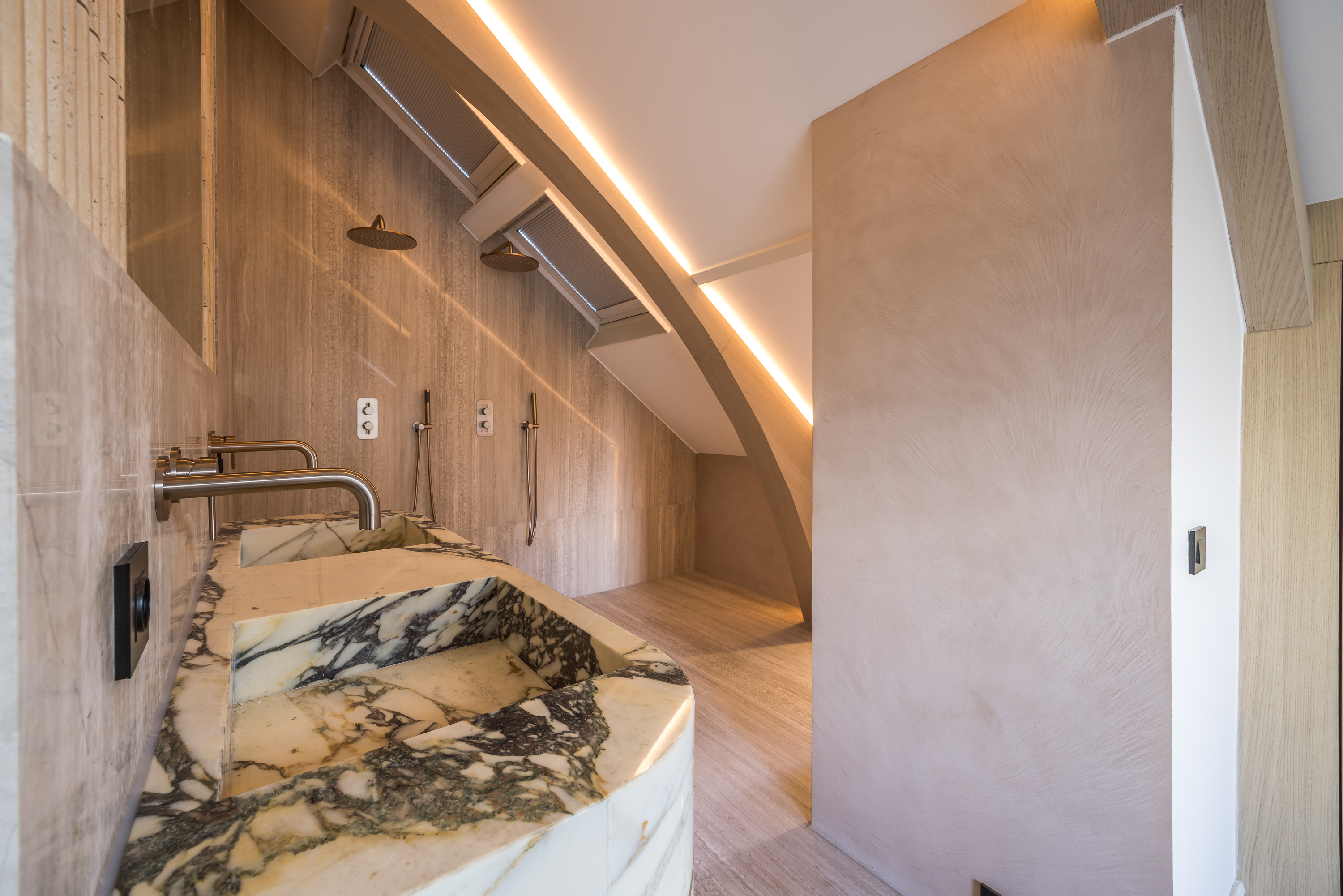 On the upper level, you will find two spacious bedrooms. The master bedroom includes an en-suite bathroom with a walk-in shower and double sink. Additionally, there is a second, equally luxurious bathroom serving the other bedroom. Both bathrooms exude the same refinement and elegance as the rest of the apartment.